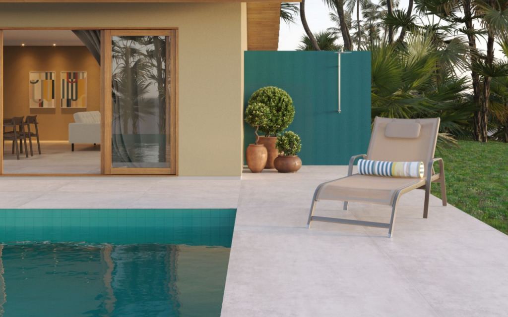 Uma piscina incrível pede um cenário à altura. Para o entorno, o segredo é o acabamento EXT. Além de garantir a segurança necessária para os pés descalços e molhados, esses revestimentos são resistentes ao sol e às variações de temperatura.