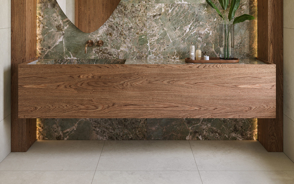 Transformar o banheiro em um “spa” em casa ficou ainda mais fácil. Usar o mesmo porcelanato no chão e nas paredes amplia o espaço. O efeito ripado na área do banho ou na bancada dá aquele charme diferenciado no ambiente.