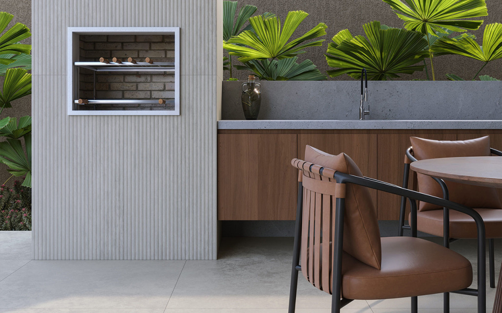 A integração com o exterior é uma forte tendência de 2026. Jaraguá Geada na área da churrasqueira cria um visual moderno. Graças à tecnologia Micro 3D, o ambiente ganha personalidade e suporta o uso constante com facilidade.