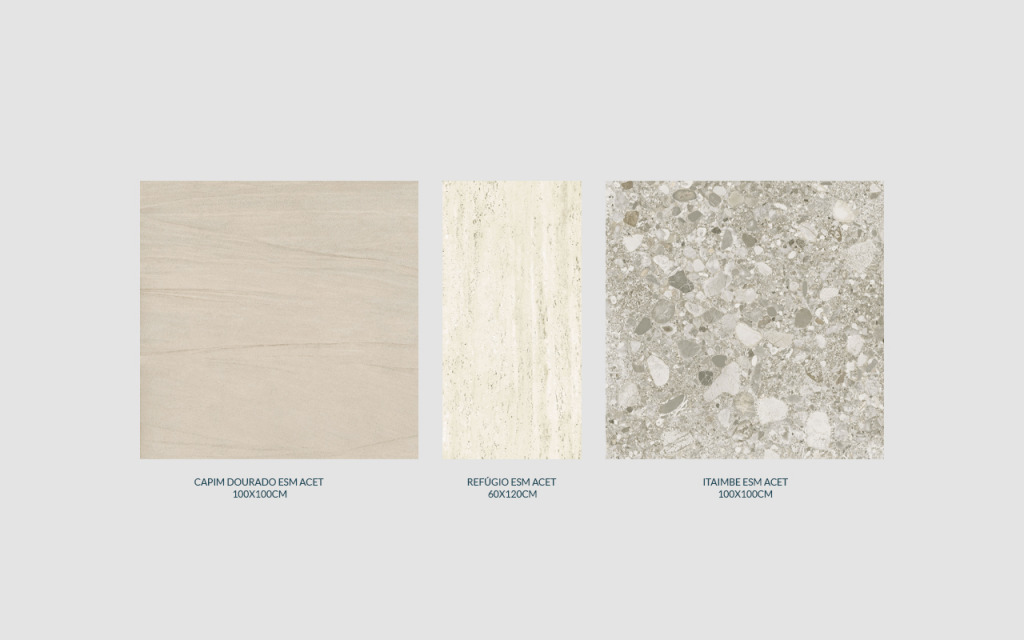 A inovação está presente em coleções que equilibram naturalidade e sofisticação: Capim Dourado, Itaimbé e Refúgio. Cada uma dessas séries traduz o toque da natureza em porcelanatos repletos de textura, cor e sensações, capazes de transformar qualquer ambiente.